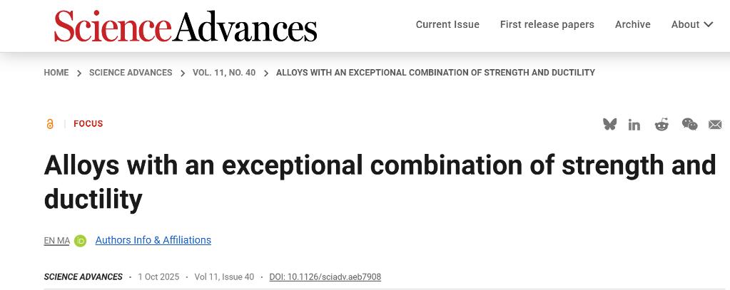 金属材料强度全国重点实验室马恩教授以《具有卓越强度与塑性组合的合金》(“Alloys with an exceptional combination of strength and ductility”)为题,于《科学》子刊《科学进展》(《Science Advances》)发表焦点文章(Focus article)。该文论证了金属材料在强化的同时保持拉伸塑性、实现高强度与大塑性共存的可行性。文章指出,在图1所示的性能范围内,高强度时拉伸率严重受限的原因往往是塑性失稳—特别是易于发生颈缩。实现高强高塑兼得的学术思想是发扬光大下述基本原理:通过在位错运动路线上设置有效阻碍,使位错举步维艰,从而达到高强度;同时利用这些频发障碍,增加位错反应和存储的机会,保持加工硬化率,抑制塑性失稳(颈缩)以延长拉伸率。