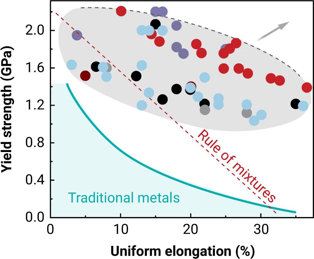 图1 兼具超高屈服强度与大均匀拉伸塑性的合金。近期研究通过维持高应变硬化率,在提升屈服强度的同时保持均匀延伸率,从而突破了过去达到的上限(红色虚线)。当前研究前沿(上沿灰色虚线)正在逼近右上角(灰色箭头)。典型案例包括超强钢(紫色)和多主元合金(最新数据以红色显示,过去几年数据以其他颜色标注)——如Fe-Mn-C-Al-Si-V、W-Ni-Fe-Ta、Ti-V-Nb- Hf-Al、Fe-Co-Ni-Al-Ta以及V-Co-Ni等(灰色区域)。