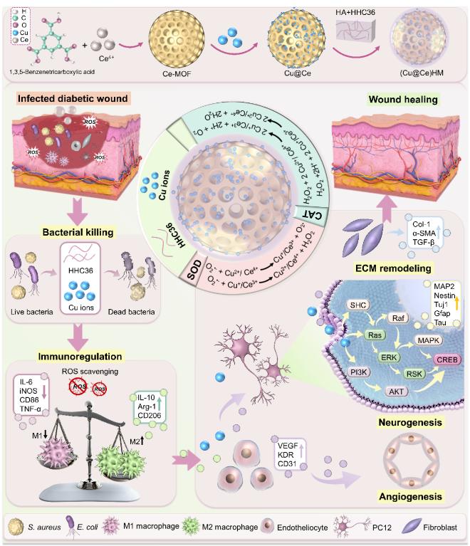 图1. (Cu@Ce)HM纳米颗粒制备过及其在糖尿病微环境中在抗菌、免疫调节、血管生成、神经生成和促进伤口愈合示意图。