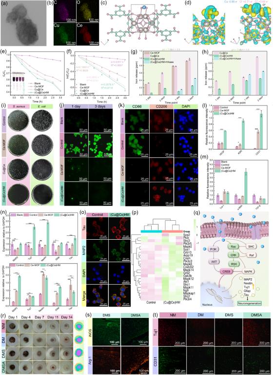 图2. (a) (b) (Cu@Ce)HM 纳米颗粒微观形貌及元素分布,(c) Ce-MOF-808结构示意图,(d) 不同角度下,Cu键合Ce-MOF电荷密度分布,(e) DPPH随时间降解曲线和代表性图像,(f) DPPH 的拟合动力学曲线以及一级速率常数,(g) (h) pH = 7.4/5.8下,Ce离子和Cu离子在1,3天的释放量,(i) Ce-MOF, Cu@Ce及(Cu@Ce)HM纳米课题的典型菌落图像,(j) (k) 巨噬细胞(RAW264.7)不同条件处理后的ROS染色及促炎因子(CD86)和抑炎因子(CD206)荧光染色的代表性图像,(l) 不同样品处理损伤巨噬细胞条件培养基培养内皮细胞(HUVEC)细胞功能因子表达,(m) 不同样品处理成纤维细胞(L929)功能因子表达,(n)不同样品处理损伤神经细胞(PC12)分化因子表达,(o) 与H2O2损伤对照组(Control)和(Cu@Ce)HM组分化相关因子Tau/MAP荧光染色代表性图像,(p) (Cu@Ce)HM与Control组之间神经分化基因表达水平相对变热图,(q) (Cu@Ce)HM 促进神经分化分子机制示意图,(r) 不同处理条件/时间点糖尿病感染伤口代表性图像,(s) 术后4天细菌感染糖尿病伤口有(DMSA)/无(DMS)(Cu@Ce)HM处理组促炎因子(iNOS)和抑炎因子(Arg-1)荧光染色代表性图像,(t)术后14天不同处理条件下伤口处神经(Tuj1)/血管(CD31)因子表达的代表性图像。
