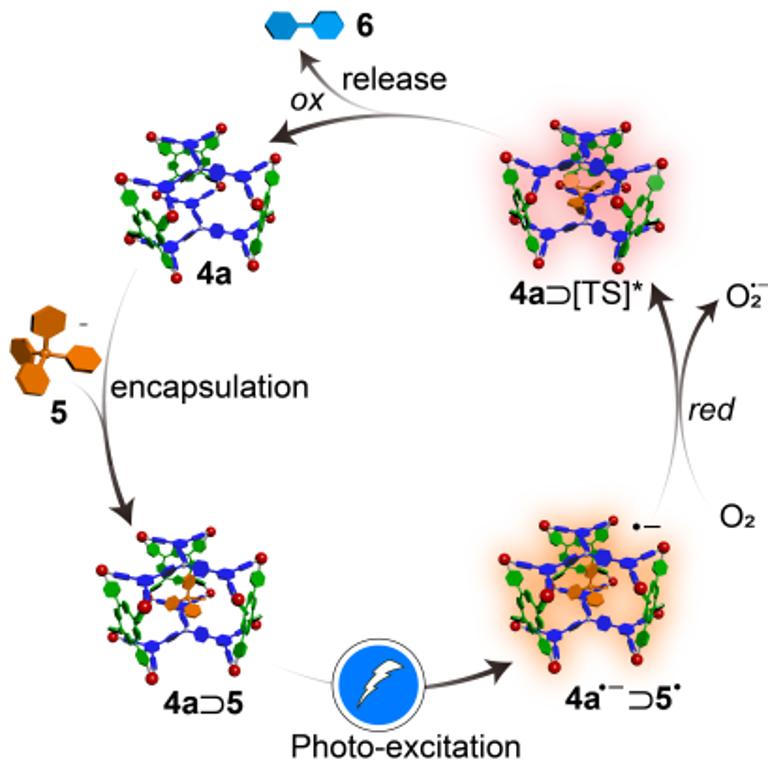 理论计算与超快光谱表明,该异质配体金属笼在可见光激发下,可发生从三苯胺到卟啉单元的定向分子间电子转移,有效促进了长寿命电荷分离态的形成,从而显著提升了超氧阴离子(O₂•⁻)的生成效率。得益于这一机制,该金属笼在四苯基硼酸盐的氧化偶联反应中表现出极高的催化活性,转化率高达99%,远超同构均配体金属笼及物理混合体系,充分证明了异质配体策略的优越性。